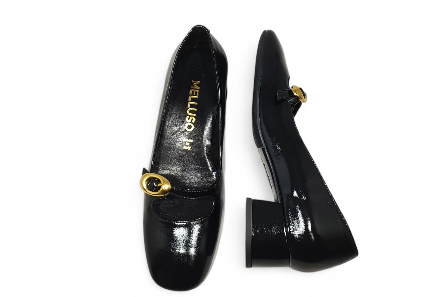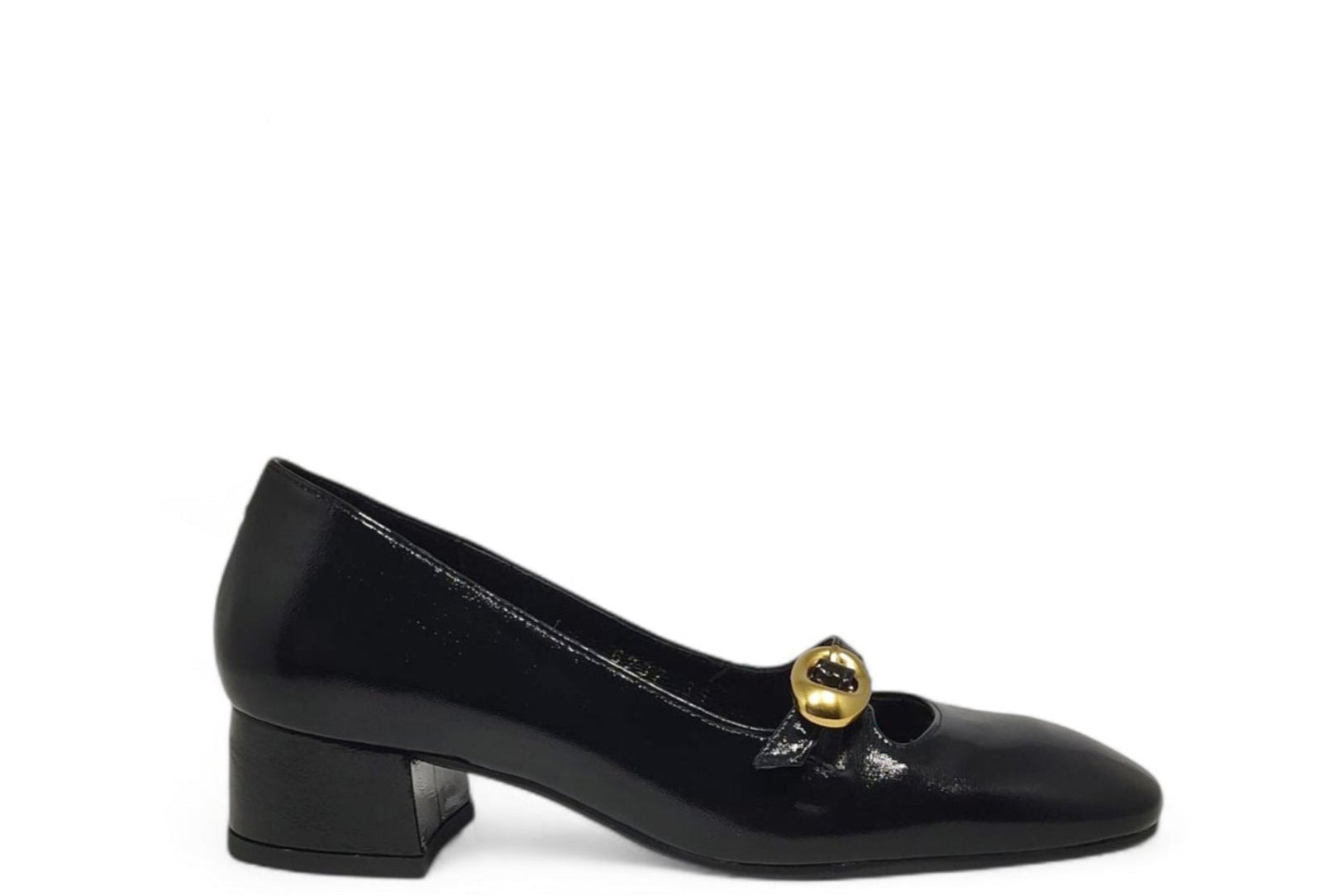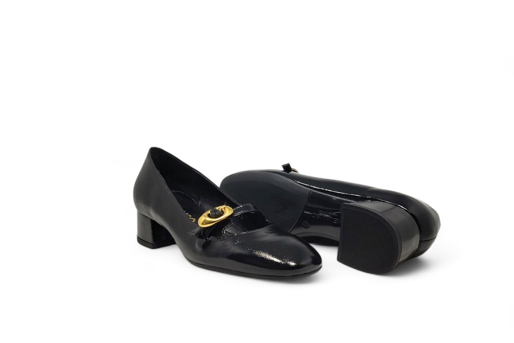 Decollete in pelle verniciata nera con cinturino . Il modello presenta un tacco fasciato 3.5 cm con suola in gomma