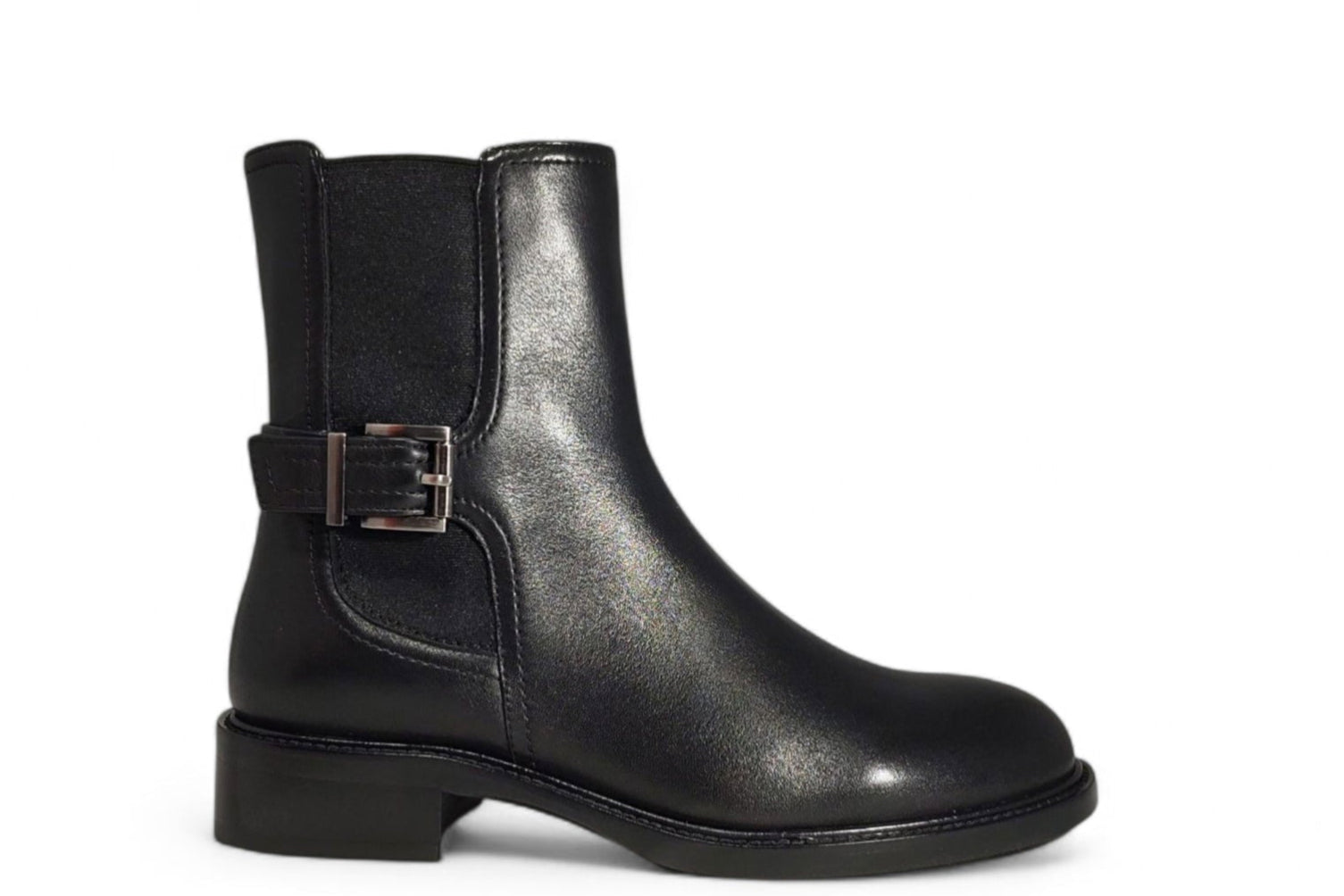 Stivaletto in pelle nera con elatico e cerniera. Suola in gomma