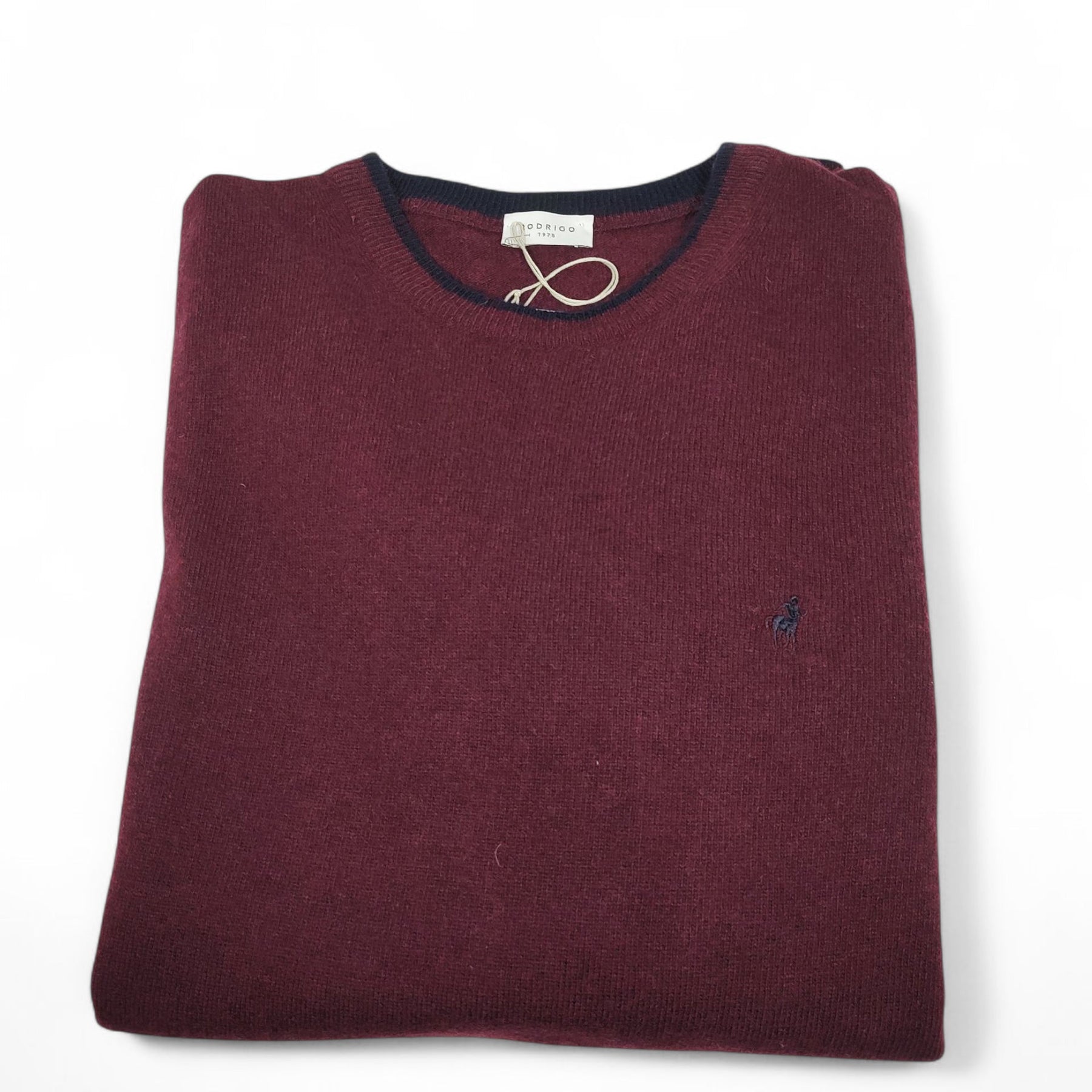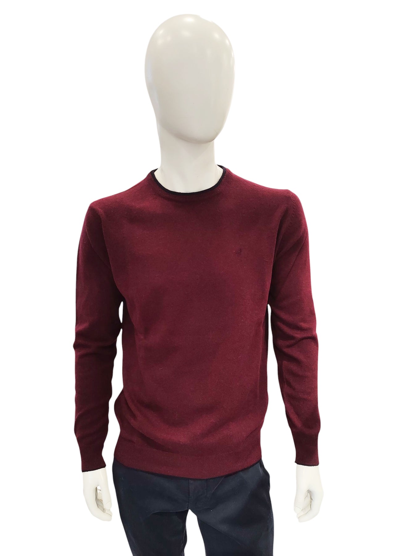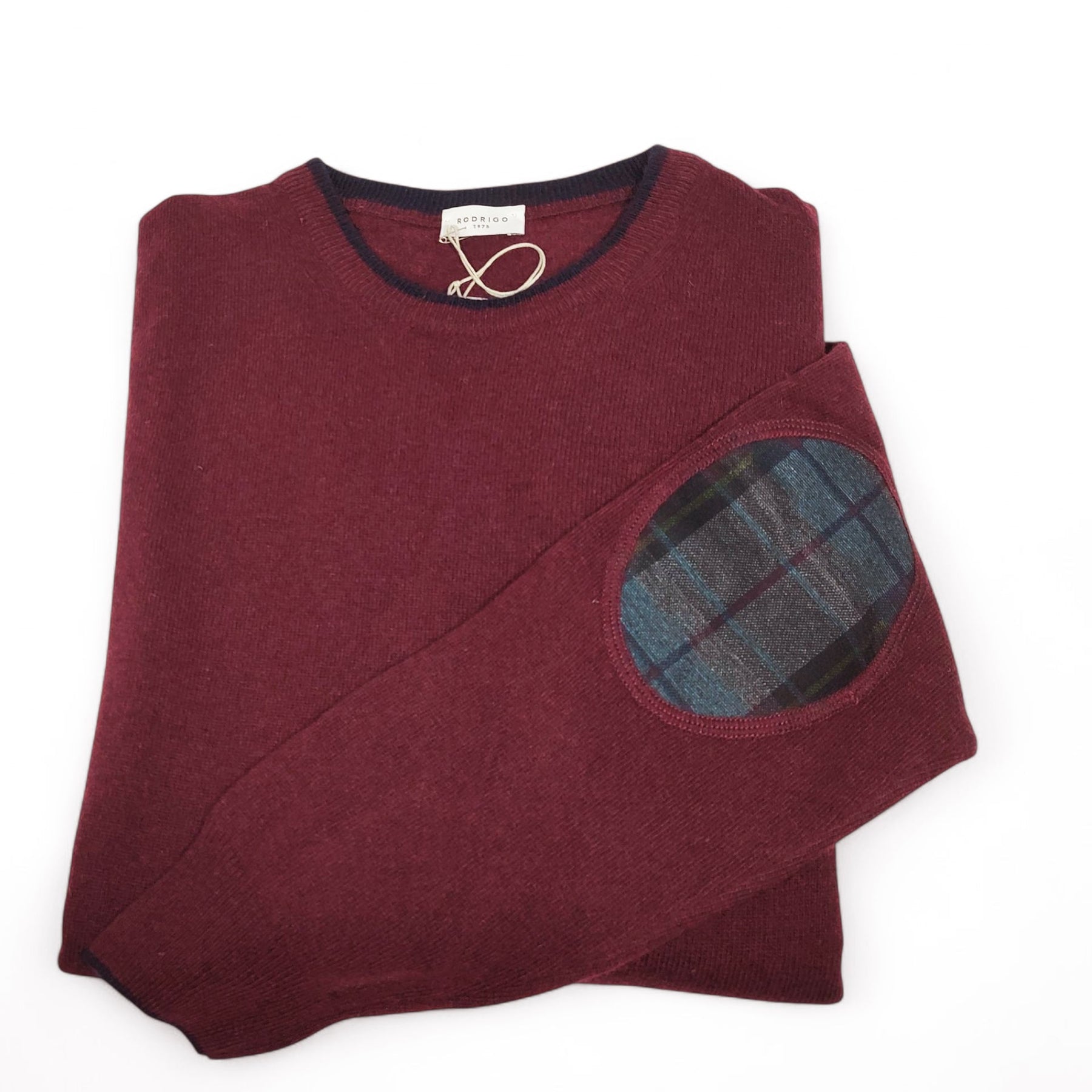Maglia girocollo bordeaux con bordino blu e toppa con trama scozzere.