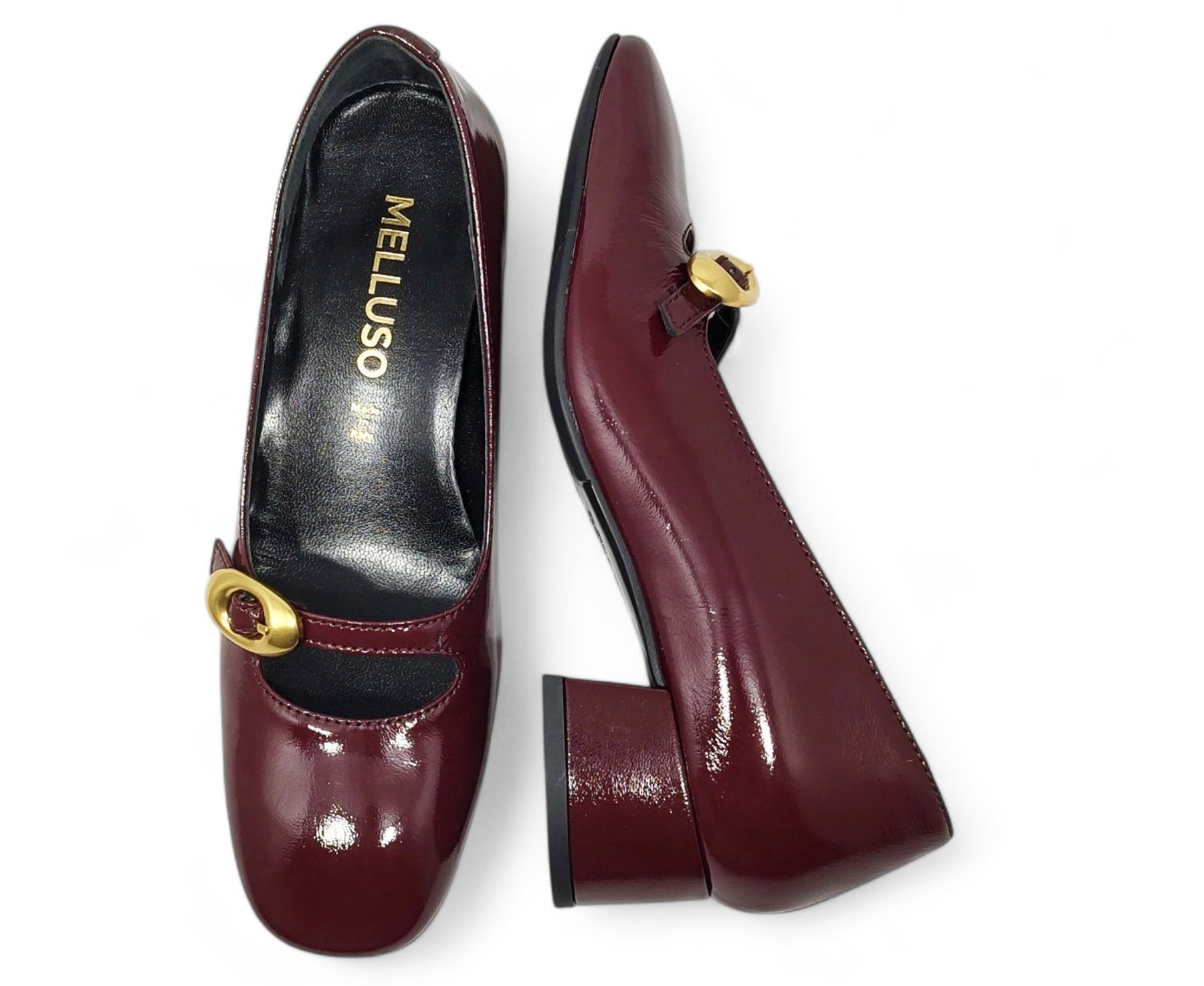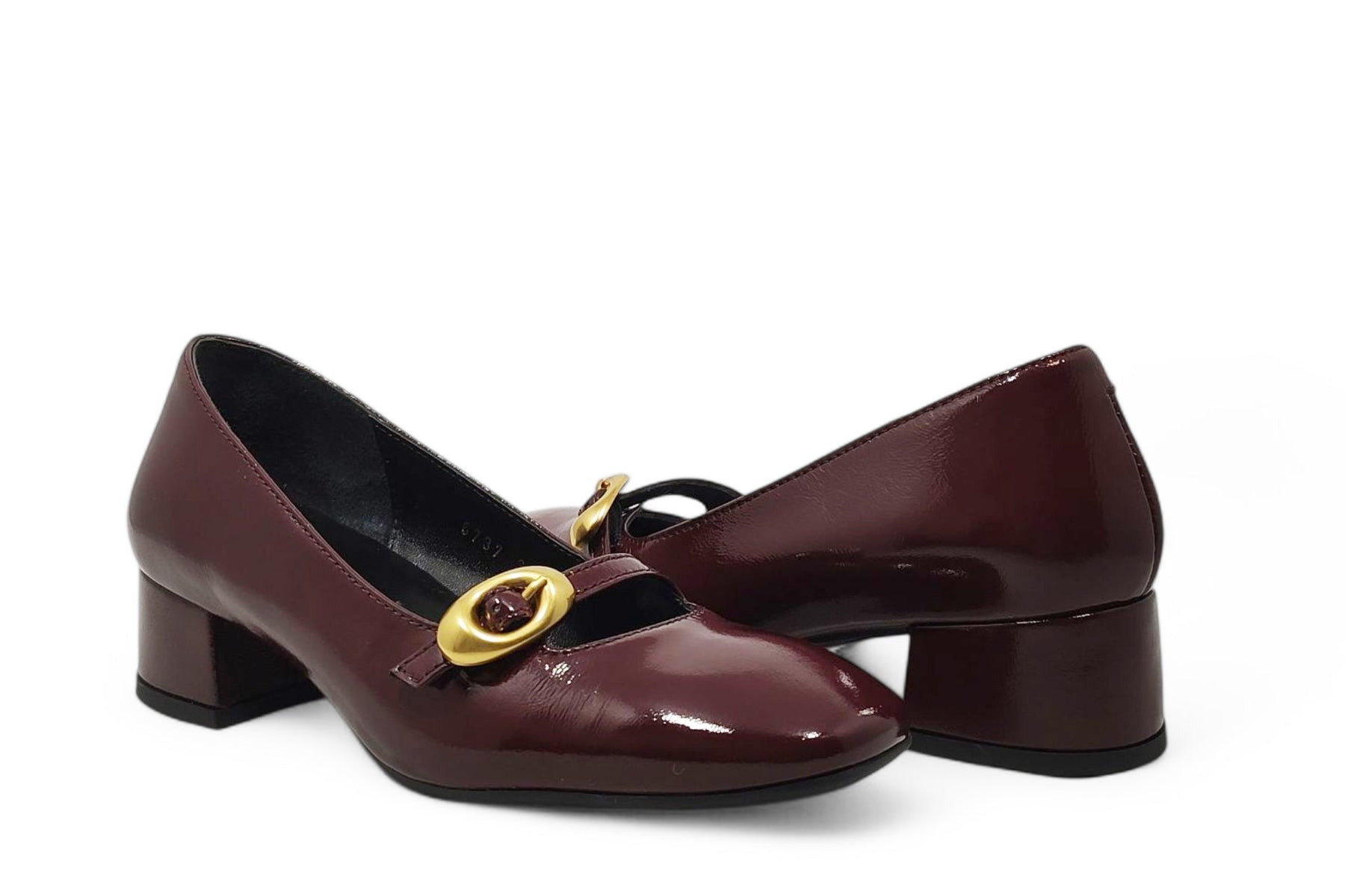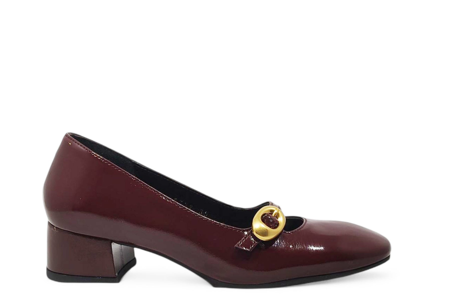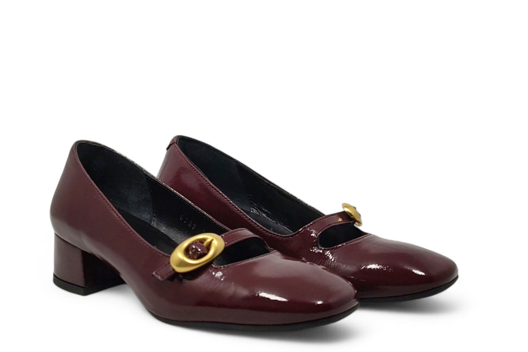 Decollete in pelle verniciata bordo con cinturino . Il modello presenta un tacco fasciato 3.5 cm con suola in gomma