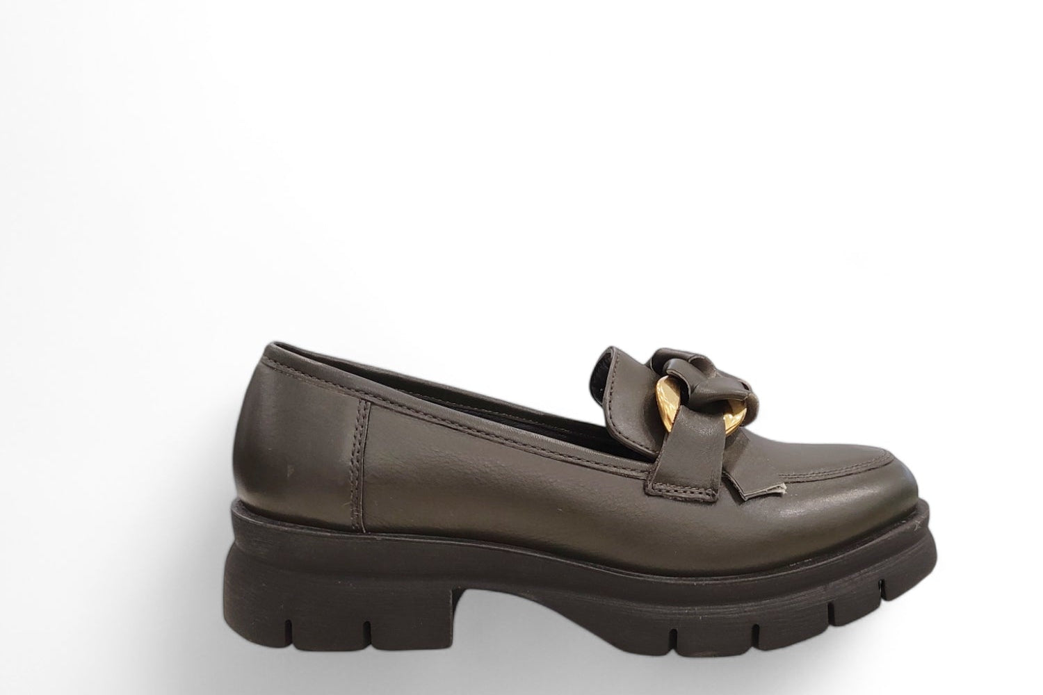 Mocassino in pelle verde con accessorio color oro e fondo gomma 3 cm
