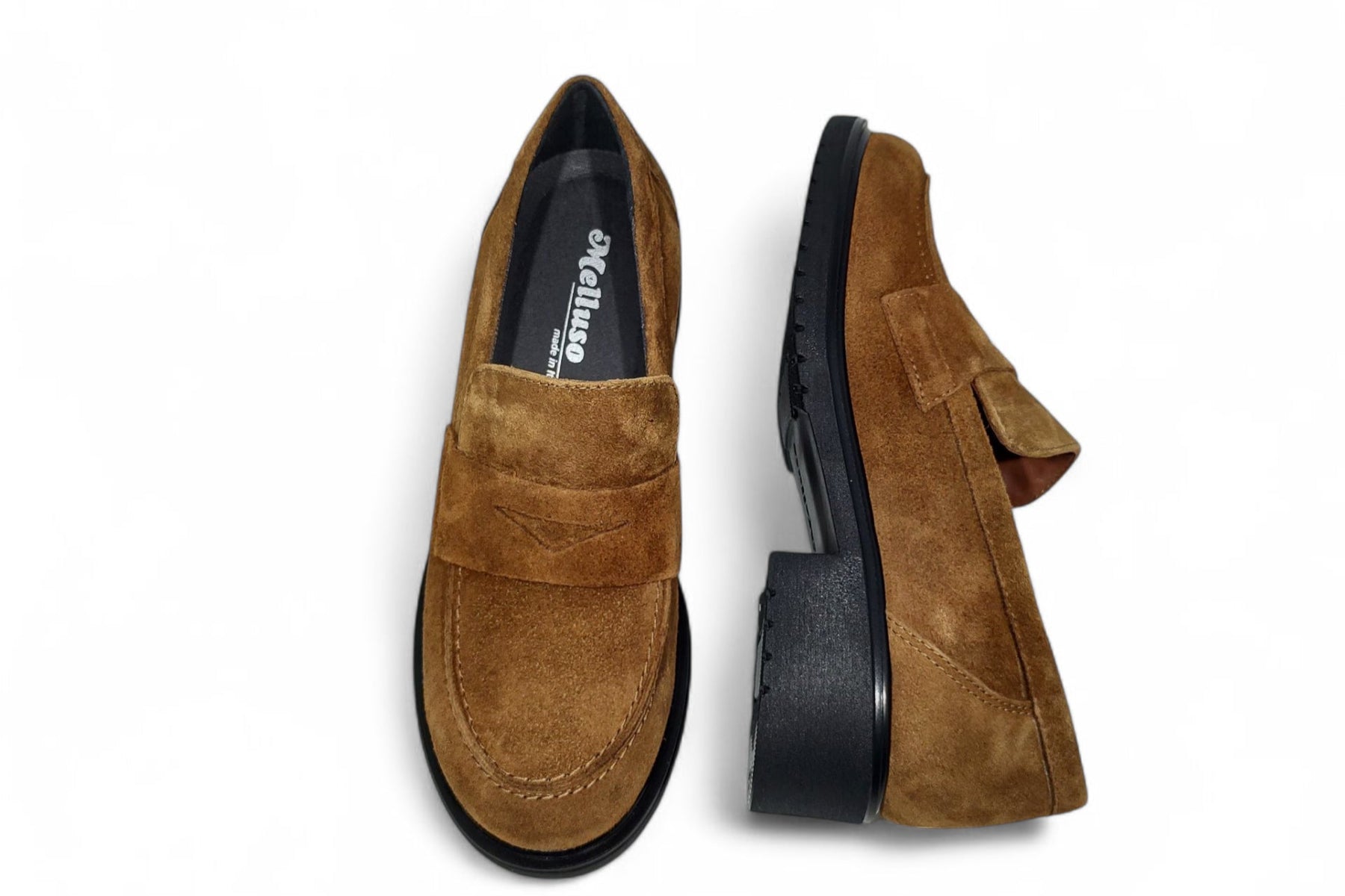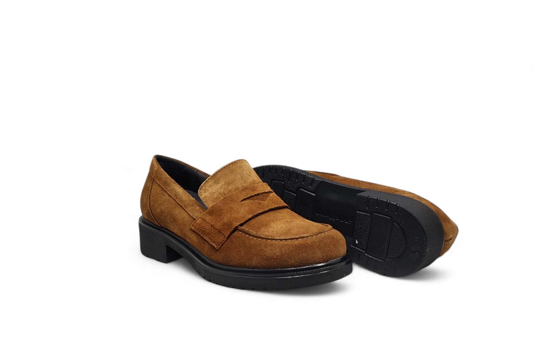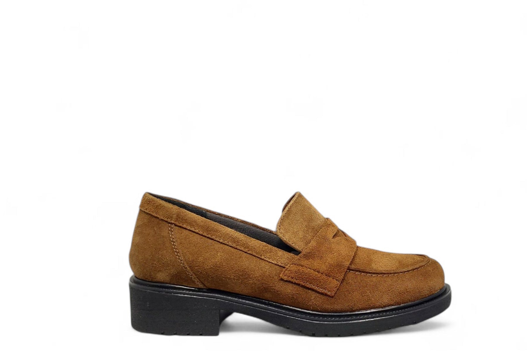 Mocassino in camoscio color cuoio con suola in gomma 3 cm e plantare estraibile.
