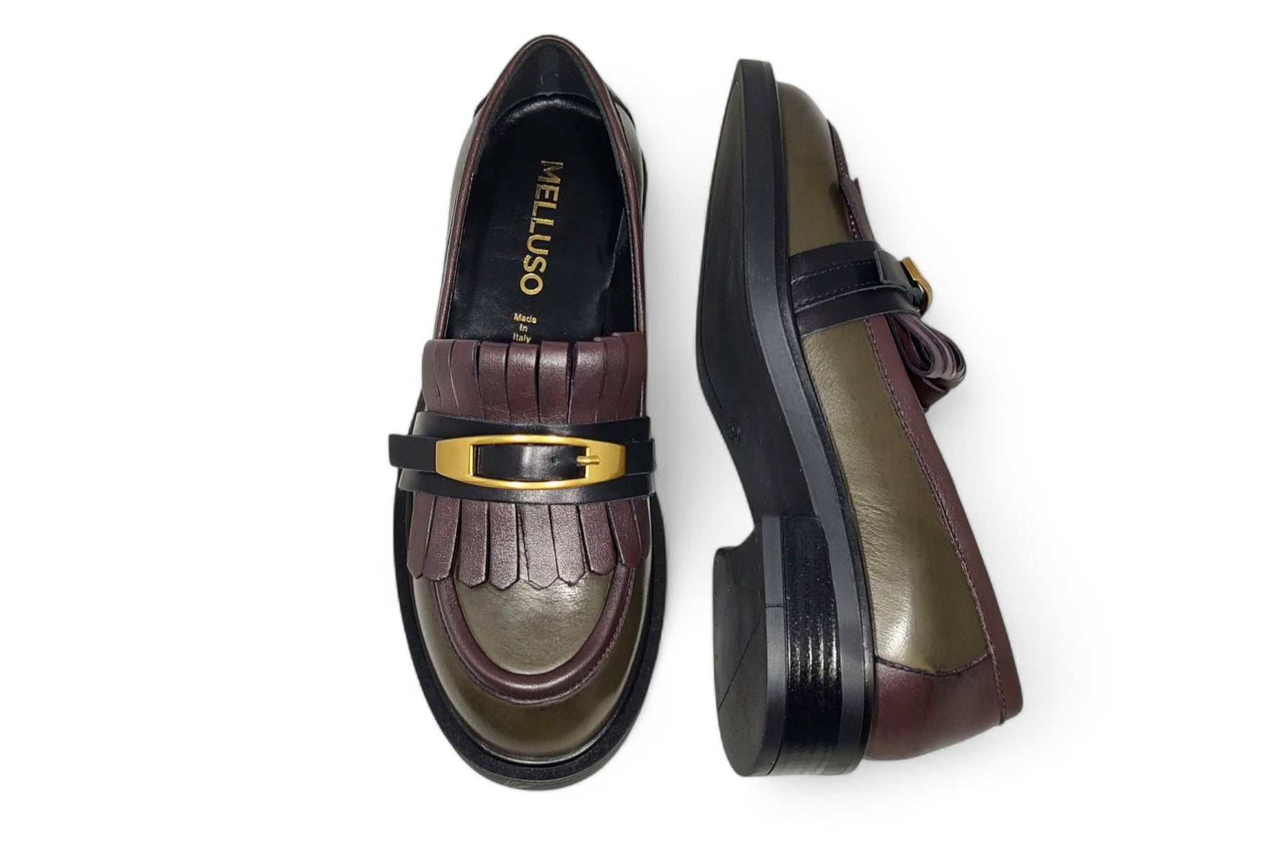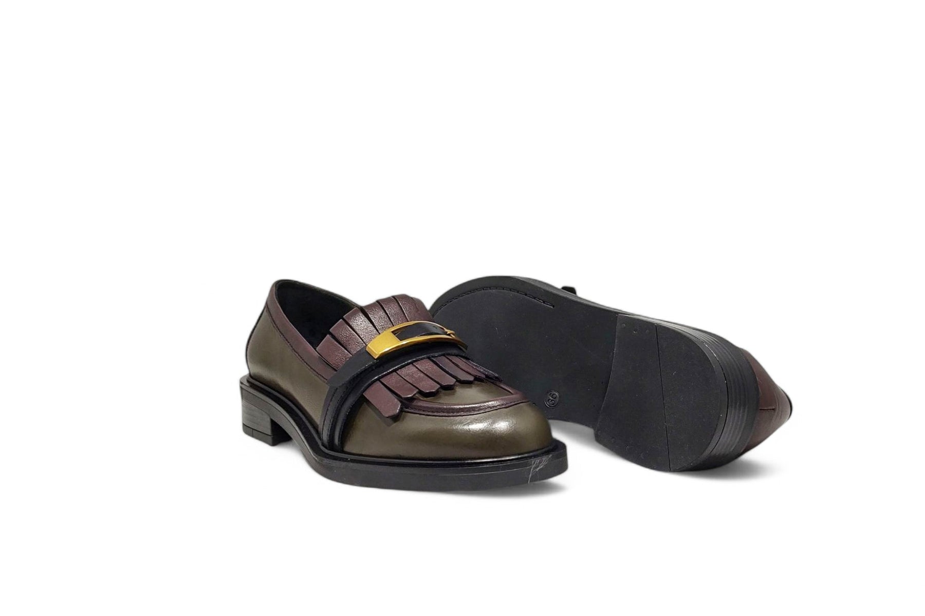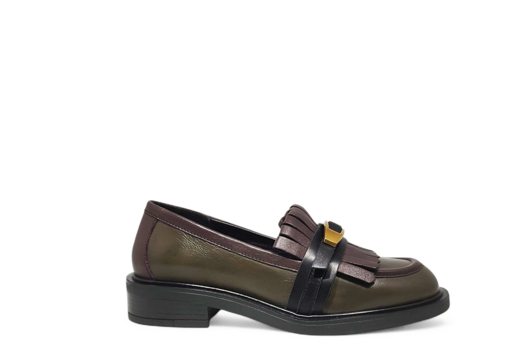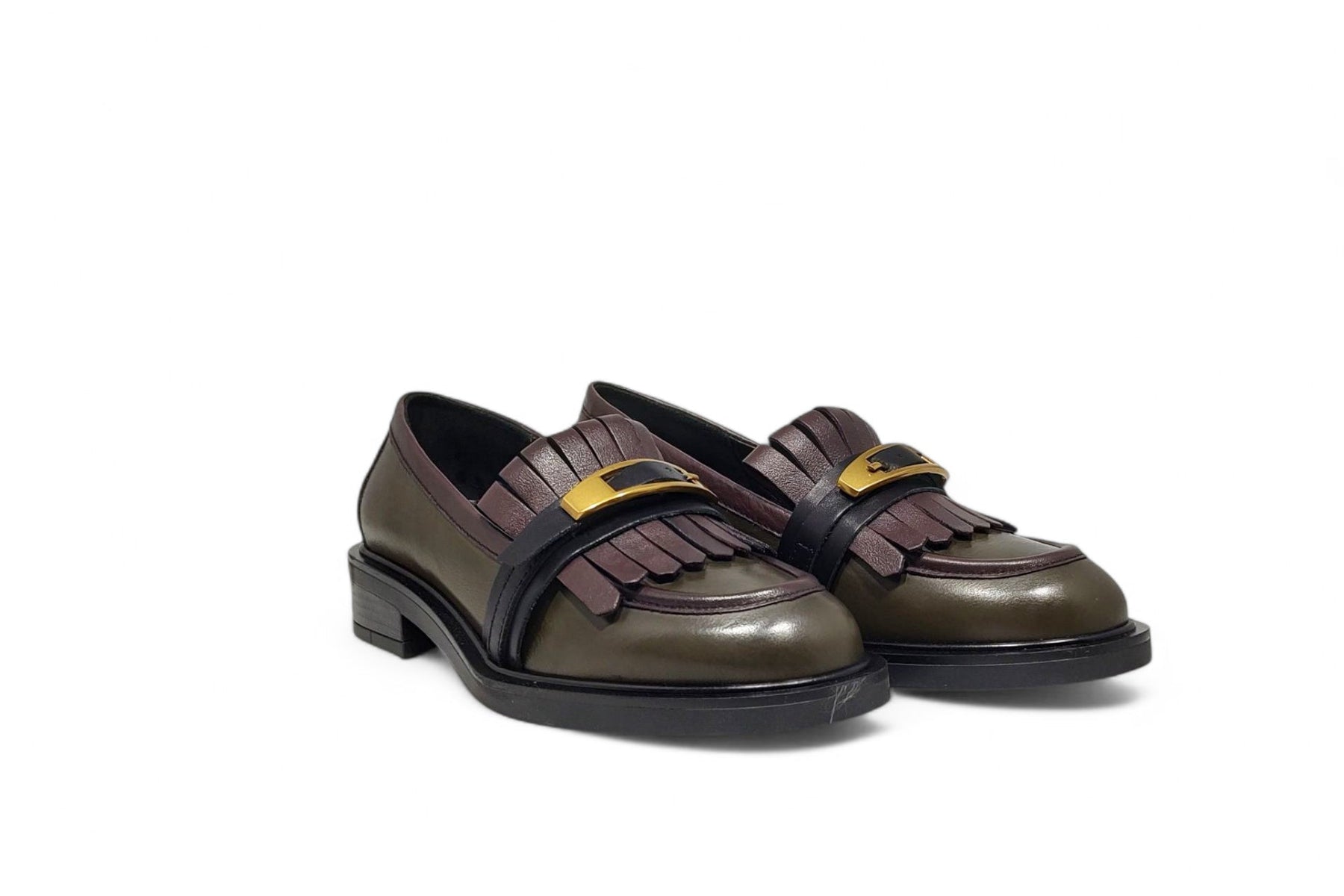 Mocassino in pelle verde con frangia e riporti color bordo e a completare un accessorio color oro