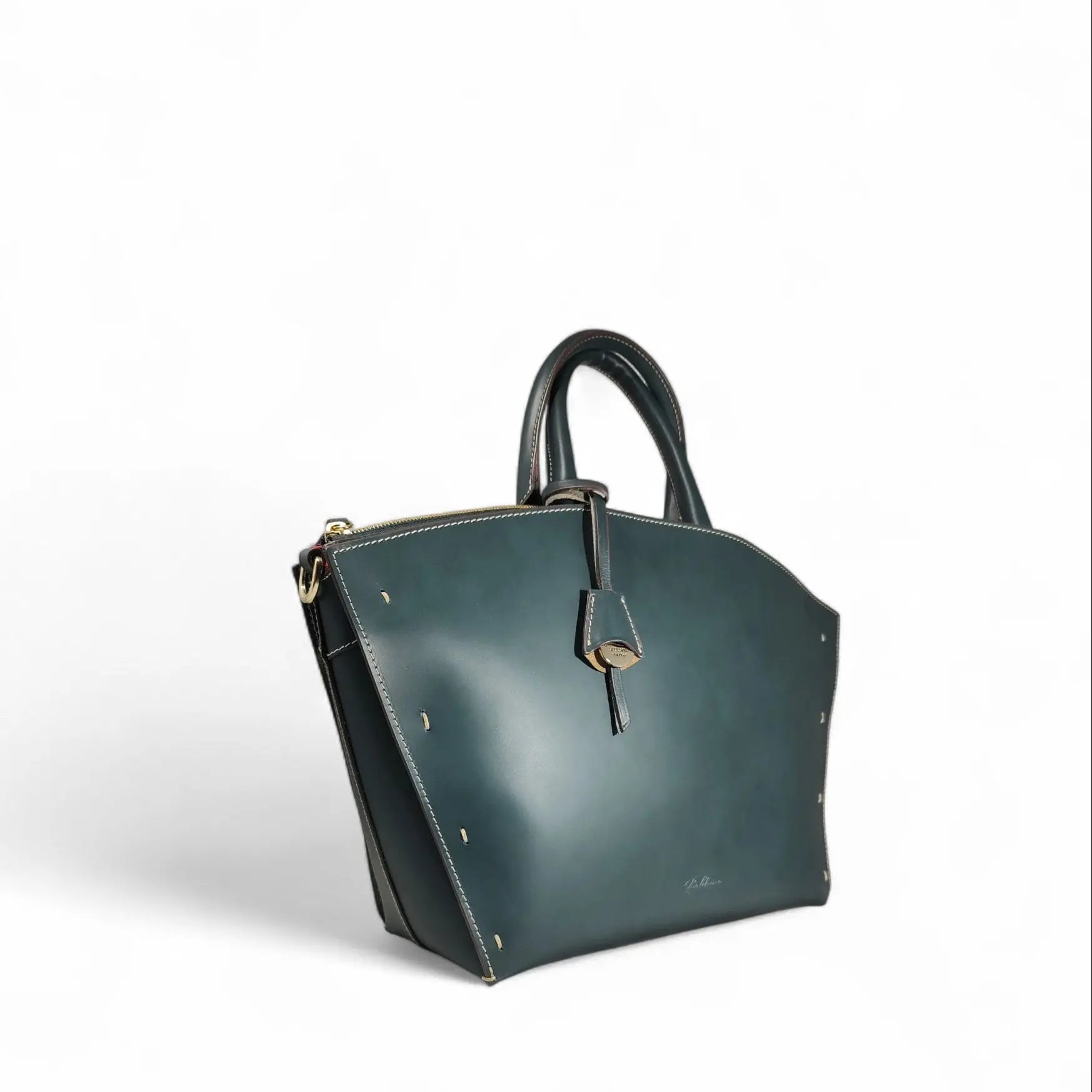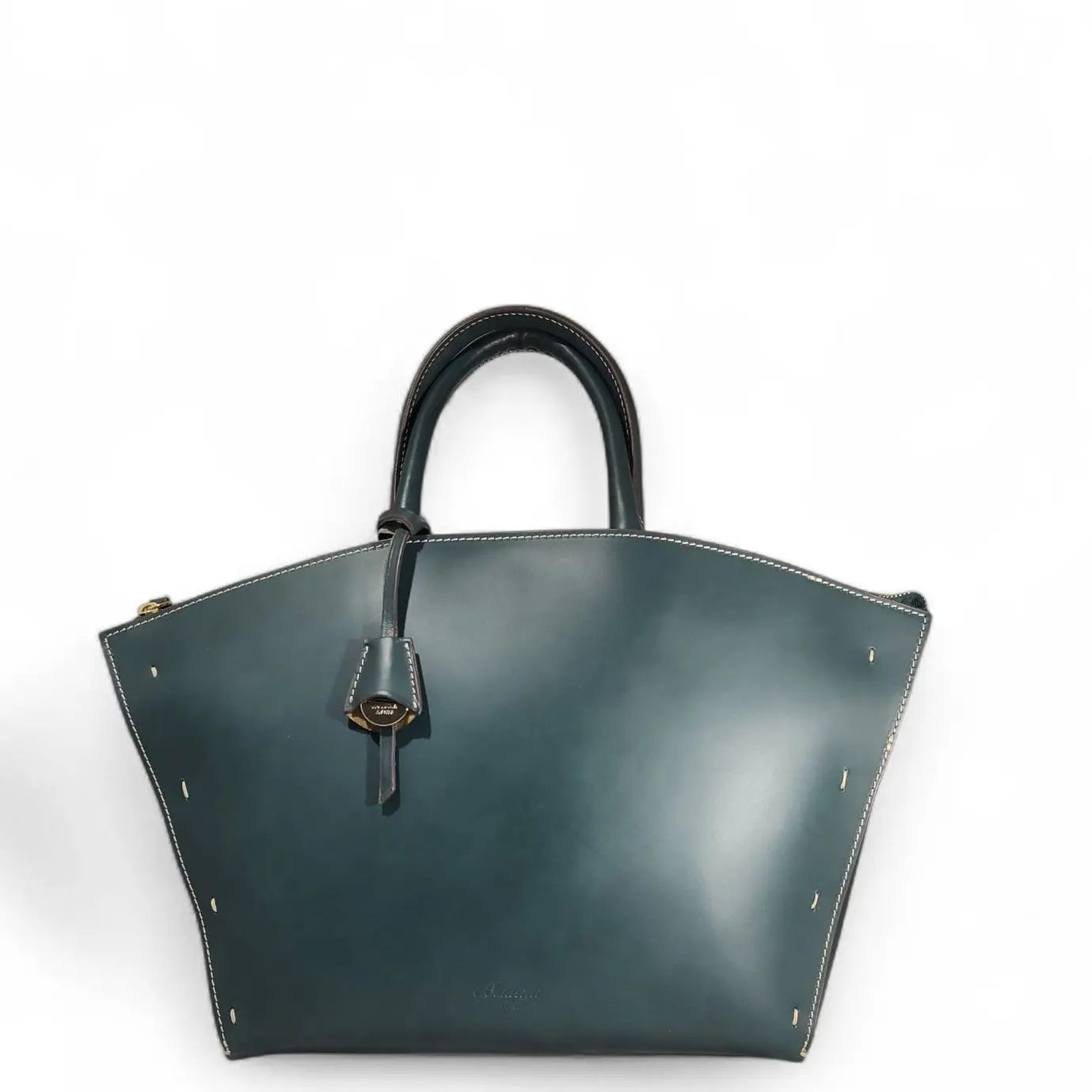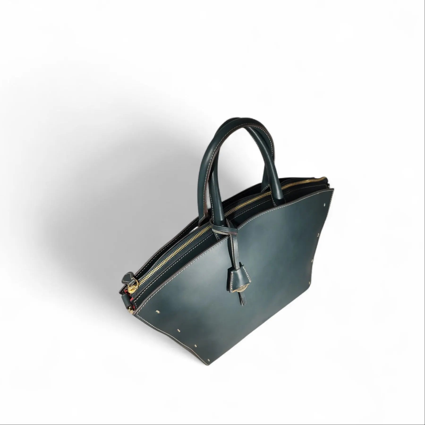 Borsa in vitello conciata al vegetale a tre scompartimenti di cui due con chiusura a calamita ed uno, quello centrale, con cerniera.