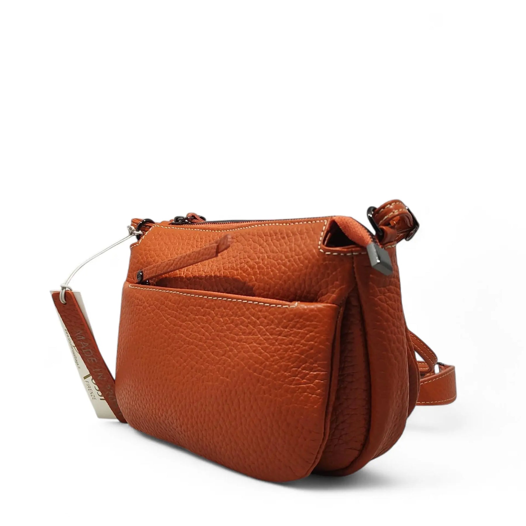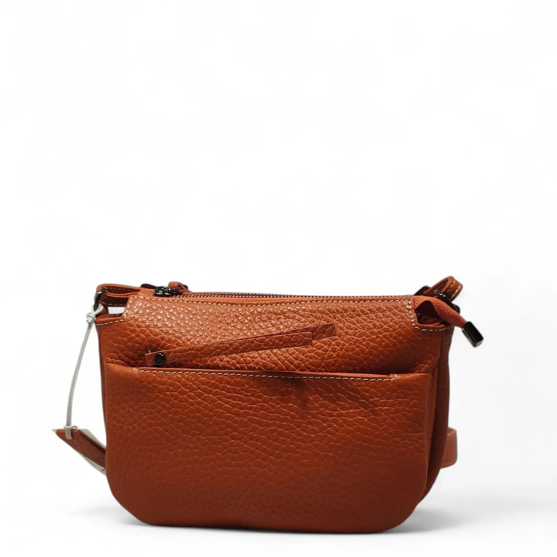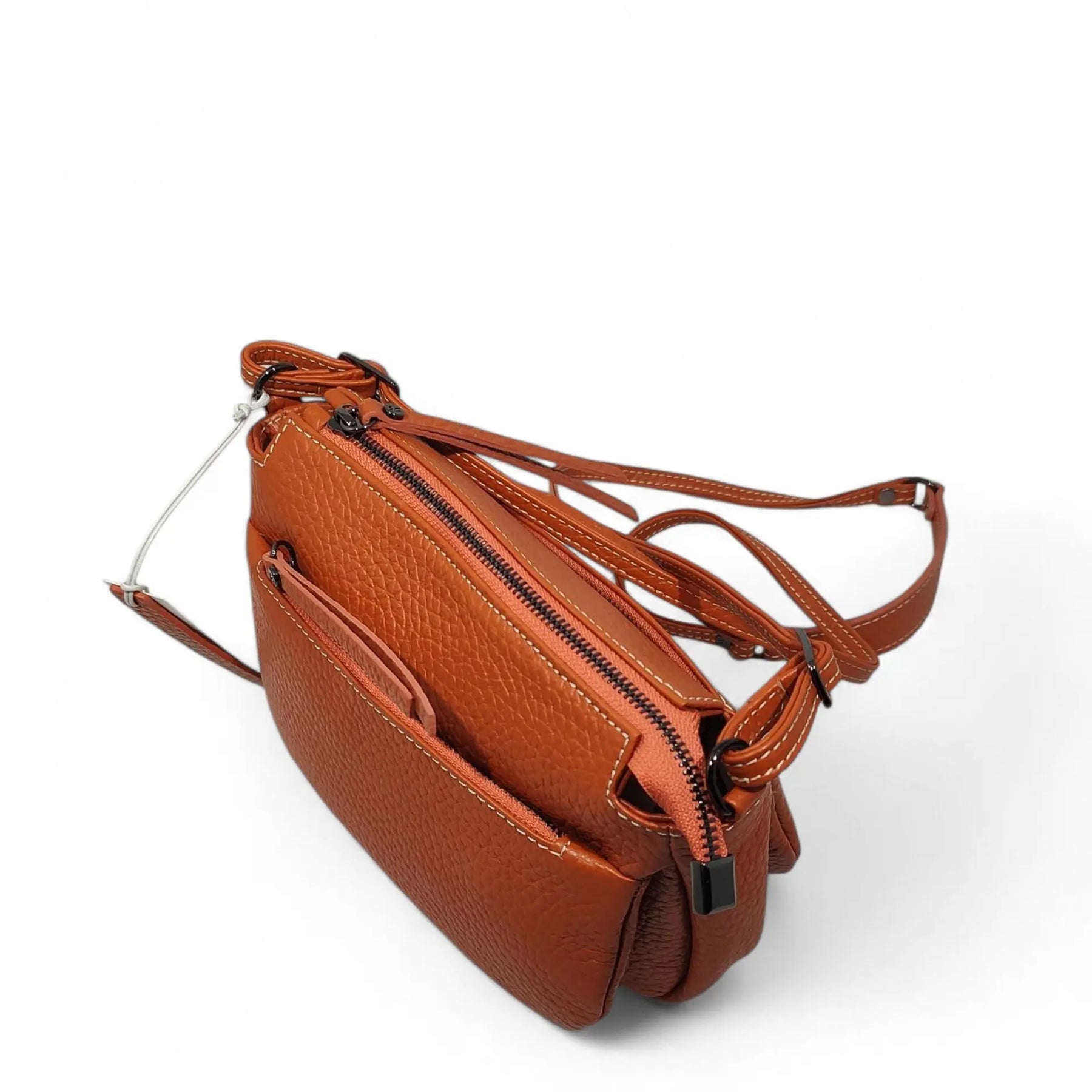 Borsetta in pelle martellata arancione scuro con tracolla regolabile e chiusura con cerniera. Comoda per viaggiare