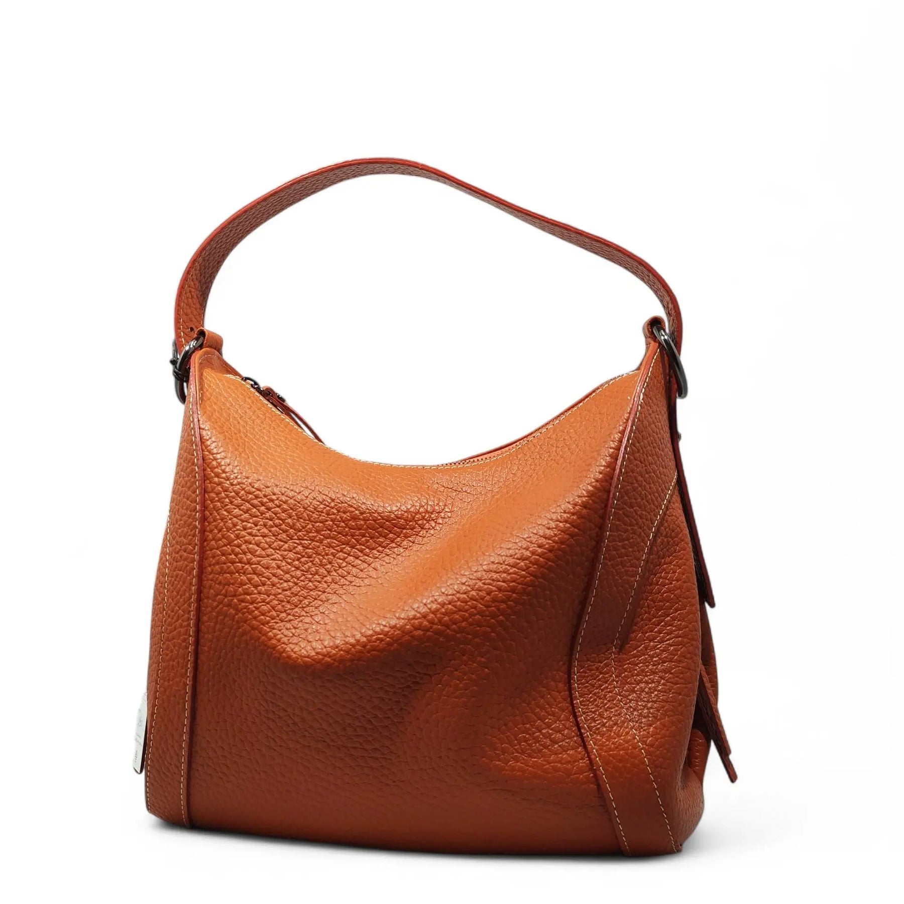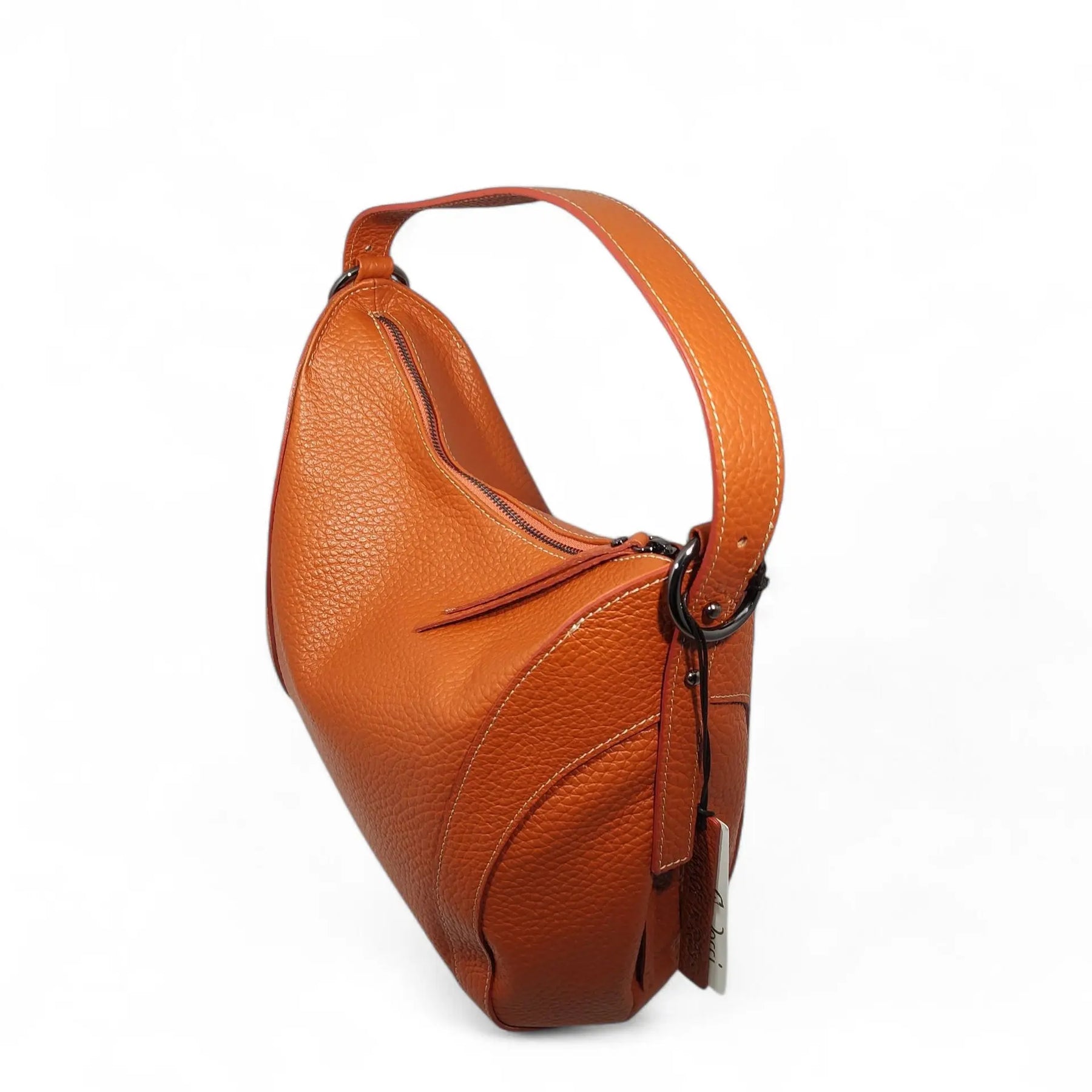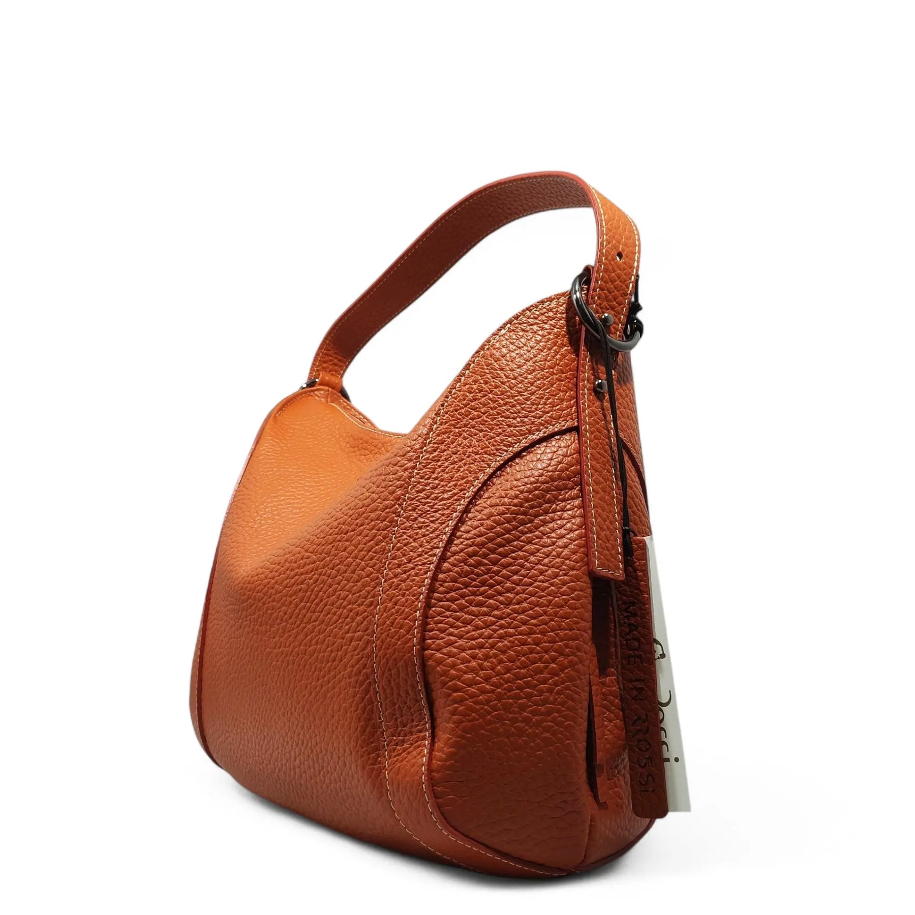 Borsetta in pelle martellata color arancione scuro con manico. Tracolla regolabile e chiusura con cerniera