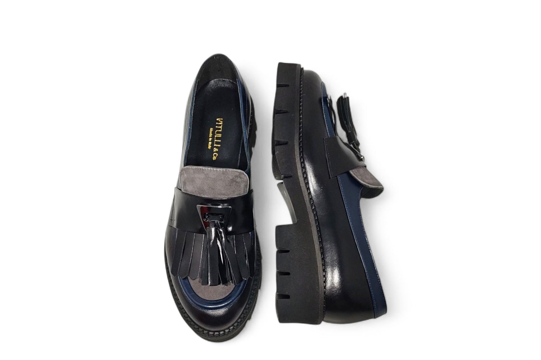 Mocassino in pelle nera con inserto blu e vaschetta in camoscio grigio con frangia e nappine.
