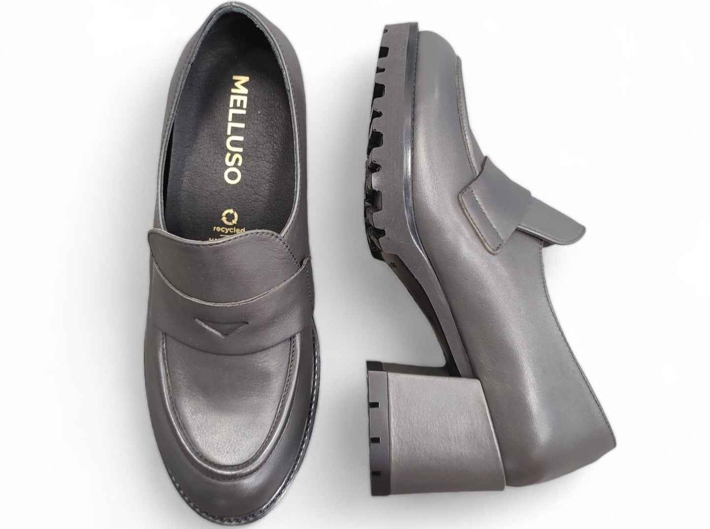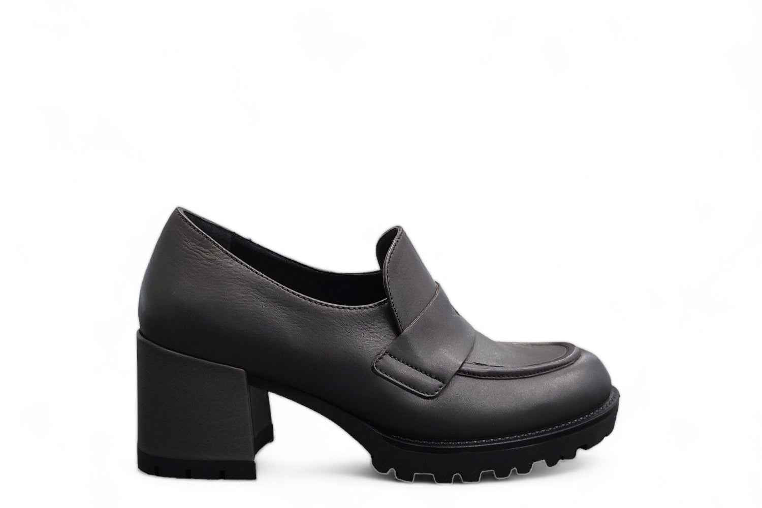 Mocassino in pelle grigia con tacco 5 cm e plateau di 1. Plantare estraibile